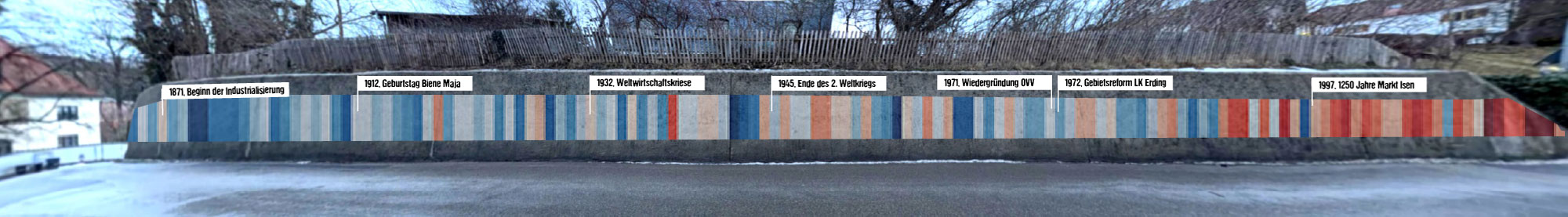 Integriert in diese Streifen sind mittlere Beschriftungen, die wichtige Meilensteine aus Isens Geschichte markieren. Dies schafft eine visuelle Verbindung zwischen der lokalen Geschichte und der globalen Klimarealität.